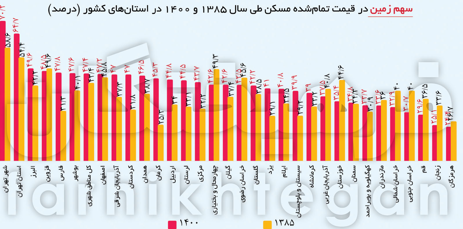 طبق داده‌های آمارهای بانک مرکزی ایران، در بین استان‌های کشور، تهران با اختلاف نسبتا بالا‌ رکورددار سهم زمین در قیمت تمام‌شده مسکن است. این داده‌ها نشان می‌دهد درحالی‌که سهم زمین در قیمت تمام‌شده مسکن در مناطق شهری کشور طی سال 1400 حدود 47.4 درصد بوده، اما این مقدار برای استان تهران 64.7 درصد و برای شهر تهران نیز بیش از 70 درصد بوده است.