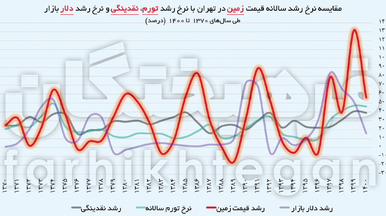 آمارها درخصوص رشد قیمت زمین در تهران بسیار قابل تامل است. برای مثال درحالی‌که قیمت زمین در شهر تهران با رشد 2043 برابری از متری 35 هزار و 250 تومان در سال 1370 به متری بیش از 72 میلیون تومان در سال 1400 رسیده اما در همین مدت قیمت دلار بازار با رشد 183 برابری از 142 تومان به 26 هزار تومان رسیده است. در همین مدت قیمت سکه تمام نیز از 12 هزار و 447 تومان با رشد 1000 برابری به حدود 12.5 میلیون تومان در سال 1400 رسیده است.
