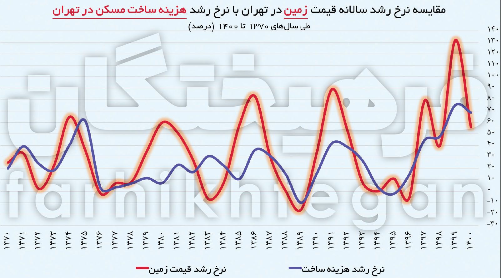 این موضوع باعث می‌شود اضافه پرش قیمت زمین بسیار بیشتر از رشد هزینه ساخت‌وساز و سایر شاخص‌ها باشد. اما نگاهی به نرخ رشد سالانه هزینه ساخت‌وساز در تهران و رشد قیمت زمین نیز نشان می‌دهد در اغلب سال‌ها پرش قیمت زمین بسیار بیشتر و شدیدتر از رشدهای هزینه ساخت بوده است. به عبارتی، درحالی‌که هزینه ساخت مسکن در تهران نزدیک به نرخ تورم کشور بوده، اما رشد قیمت زمین دارای اضافه پرش قابل‌توجهی بوده است.