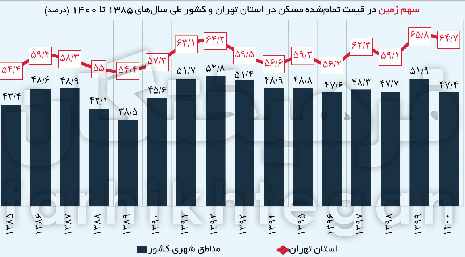 بررسی داده‌های بانک مرکزی نشان می‌دهد سهم زمین در قیمت تمام‌شده ساختمان‌های شروع شده توسط بخش خصوصی در مناطق شهری کشور از 43.4 درصد در سال 1385 به 51 تا 53 درصد در سال‌های 1391 تا 1393 رسیده است. این مقدار در سال‌های 1394 تا 1398 بین 48 تا 49 درصد بوده و در سال 1399 حتی 52 درصد را نیز به ثبت رسانده است. در سال 1400 این مقدار در کل کشور 47.4 درصد بوده است.