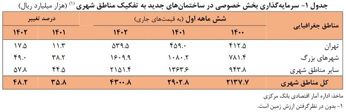 در ارتباط با سرمایهگذاری بخش خصوصی ساختمان لازم به توضیح است که براساس آمار اداره آمار اقتصادی این بانک در شش ماهه اول سال ۱۴۰۲ میزان سرمایهگذاری در ساختمانهای جدید مناطق شهری به قیمتهای جاری با افزایش ۴۸.۲ درصدی نسبت به مدت مشابه سال قبل به ۴۳۰۰.۸ هزار میلیارد ریال رسید. این میزان عملکرد به قیمتهای ثابت سال ۱۳۹۵ نشان از افزایش ۶ درصدی سرمایهگذاری حقیقی در ساختمانهای جدید مناطق شهری نسبت به شش ماهه اول سال ۱۴۰۱ دارد.