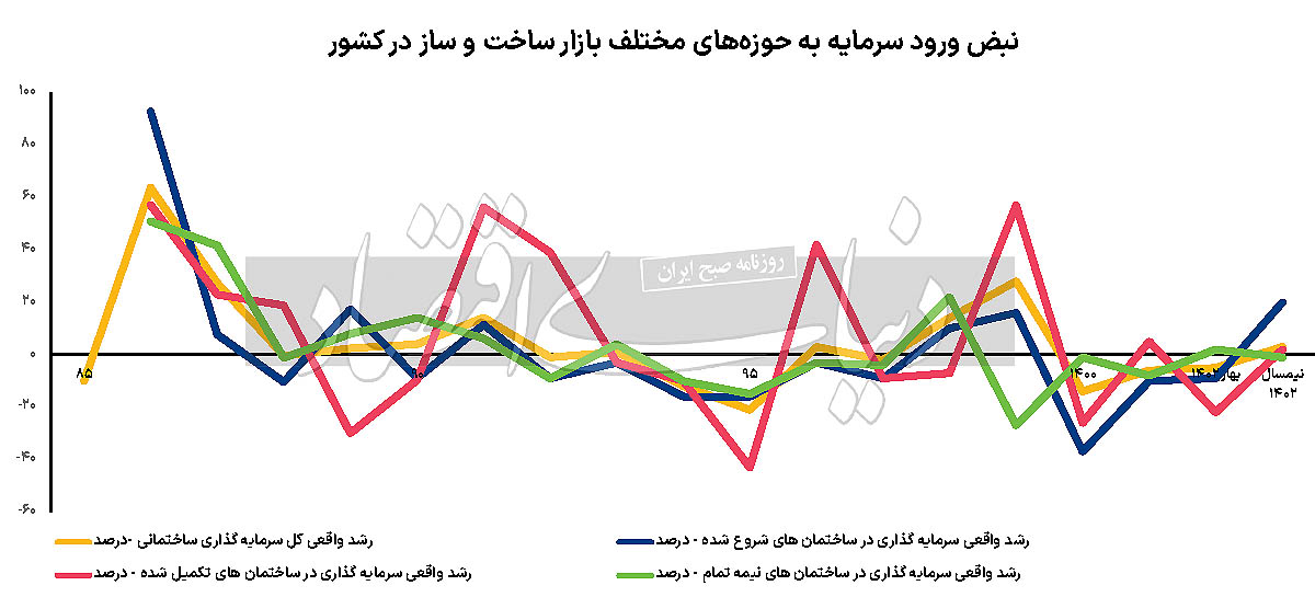 این میزان در سال 1401، فقط 5‌درصد رشد مثبت را نشان می‌دهد. بهار امسال، همین نرخ یعنی رشد واقعی حجم ریالی سرمایه‌گذاری ساختمانی در کشور، منفی 22درصد بوده، یعنی حجم ریالی سرمایه‌گذاری با لحاظ تورم، 22‌درصد نسبت به بهار سال گذشته افت داشته است و در نیمسال اول 1402 نیز تنها یک رشد خفیف 2درصدی را نسبت به 6 ماه اول سال 1401 نشان می‌دهد.