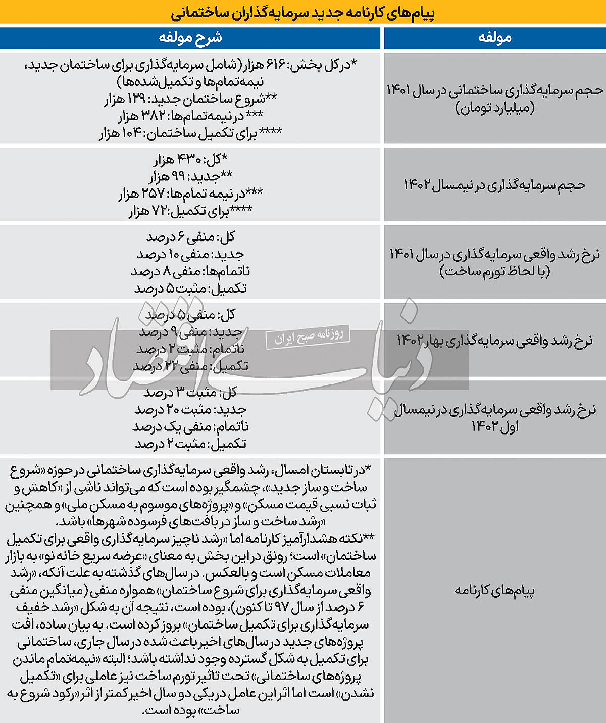 کارنامه سرمایه‌گذاری ساختمانی در کشور، یک بخش سیاه دارد که نشان‌دهنده وضعیت نامناسب سرمایه‌گذاری در حوزه تکمیل ساختمان (سرمایه‌گذاری منجر به عرضه آپارتمان نو به بازار)، است. بر اساس آمارهای رسمی، حجم ریالی سرمایه‌گذاری ساختمانی در حوزه تکمیل ساختمان در سال 1400 نزدیک به 30‌درصد افت واقعی نسبت به مدت مشابه سال قبل (1399) داشته است.