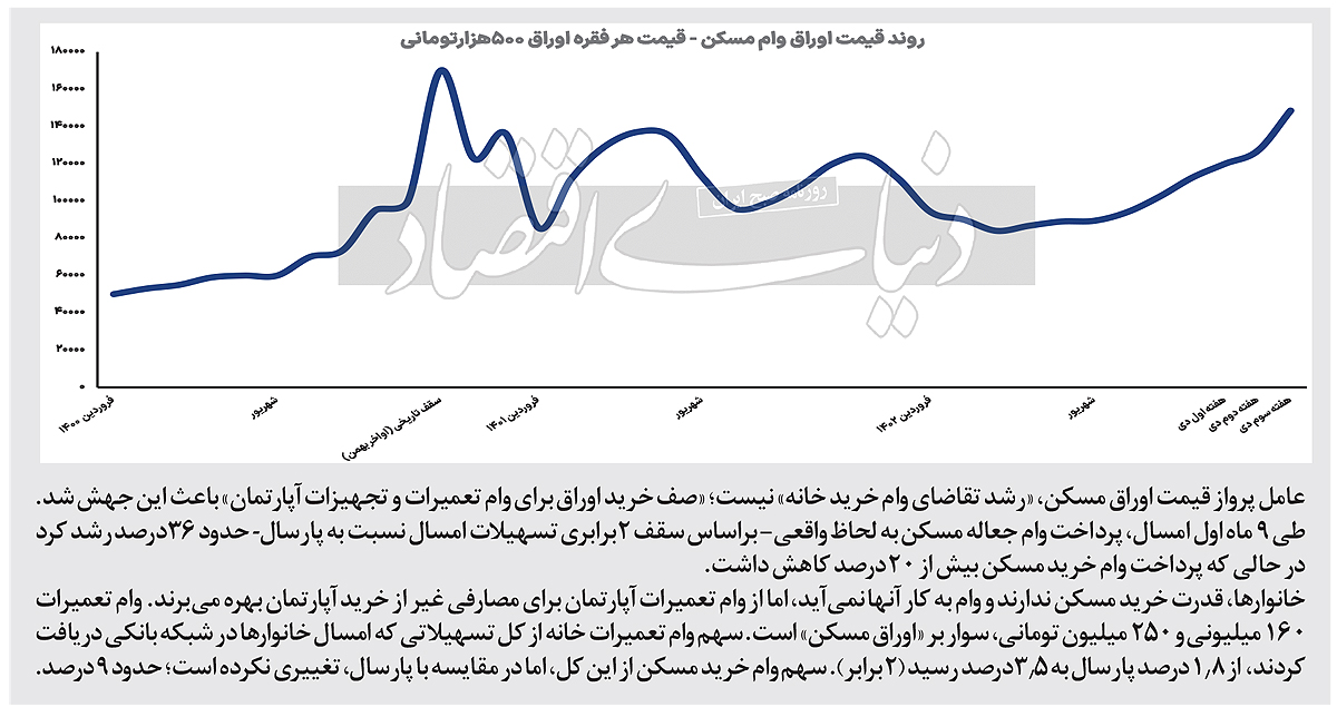در ماه‌های گذشته از سال 1402، هم مطابق واقعیت درونی بازار معاملات مسکن و هم با استناد به «آمار استفاده از وام خرید مسکن»، تقاضا برای استفاده از این نوع وام –تسهیلات خرید خانه- افزایش پیدا نکرده است. طی 9 ماه اول امسال، حجم ریالی پرداخت تسهیلات خرید مسکن مطابق گزارش بانک مرکزی، حدود 83‌هزار میلیارد تومان بوده که در مقایسه با مدت زمان مشابه در سال 1401، رشد 66 درصدی داشته است.  ظاهر این رشد پرداخت، رشد تقاضای خرید اوراق مسکن به قصد خرید خانه را بیان می‌کند اما یک «خطای دید» این وسط وجود دارد و آن، «افزایش 2 برابری سقف مبلغ وام مسکن در سال‌جاری نسبت به سال گذشته» است. با لحاظ افزایش مبلغ وام‌‌های مسکن –از جعاله تا خرید- مشخص می‌شود، طی 9 ماه اول امسال، در واقعیت، میزان استفاده از وام خرید مسکن، بیش از 20‌درصد کمتر از حجم استفاده در سال گذشته است.