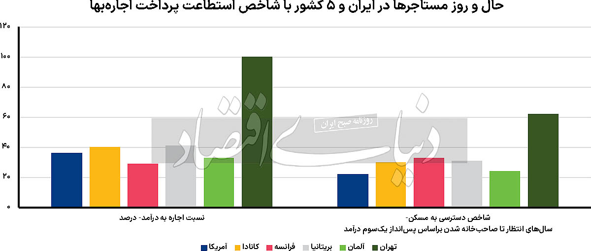 بررسی‌‌‌ها نشان می‌‌‌دهد که سهم اجاره‌‌‌بها از درآمد خانوار 5 کشور اروپایی و آمریکایی شامل ایالات متحده، انگلیس، فرانسه، کانادا و آلمان به طور میانگین 35‌درصد است. این در حالی است که همین شاخص برای تهران حدود 100درصد(براساس متوسط دستمزد خانوار تک شغله) و در کل کشور میانگین بالای 70درصد است.