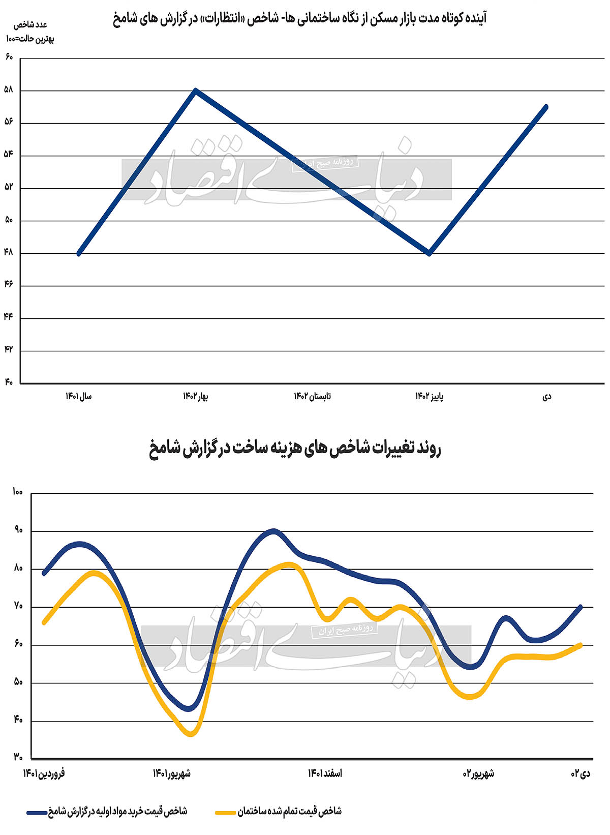 این موضوع یک تناقض آشکار در روایت سازنده‌‌ها از وضعیت بازار ساخت‌وساز است. عدد شامخ کل در این گزارش، 49.45 و زیر عدد 50 است. در گزارش شامخ، اعداد کمتر از 50 روایتگر شرایط نامطلوب در موضوع مورد پرسش از سازنده‌‌هاست. عدد شامخ کل، برآیند وضعیت همه مولفه‌‌های مورد سنجش در این نظرسنجی از سازنده‌‌ها را نشان می‌دهد و روایت‌‌کننده شرایط کلی بازار ساخت‌وساز بر اساس نظر آنهاست. عدد مربوط به شاخص قیمت خرید مواداولیه و لوازم موردنیاز ساخت مسکن از ناحیه افزایش قیمت مصالح ساختمانی نیز از 63 به مرز 70 رسیده است. همچنین عدد مربوط به شاخص هزینه تمام شده ساخت مسکن هم از 57 به مرز 60 رسیده است. در چنین شرایطی اما عدد مربوط به شاخص انتظارات سازنده‌‌ها در ارتباط با فعالیت‌‌های شرکت در ماه بعد، از 51 در آذرماه به 57.14 در دی ماه رسیده است. این موضوع نشان می‌دهد در همان ماهی که سازنده‌ها افزایش هزینه ساخت مسکن را اعلام کرده‌‌اند اما شاخص انتظارات در مسیر بهبود تغییر جهت داده است.