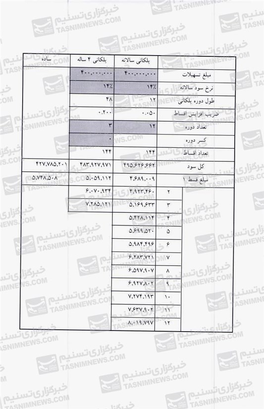 همچنین در روش پلکانی 4ساله میزان سود تسهیلات 60 میلیون تومانی 72 میلیون و 589 هزار و 195 تومان است. رقم اقساط ماهانه این تسهیلات در ک دوره 48ماهه اول 758 هزار و 866 تومان است، در دوره 48ماهه دوم این رقم به 910 هزار و 640 تومان افزایش مییابد. در دوره 48ماهه سوم نیز رقم اقساط ماهانه یک میلیون و 92 هزار و 786 تومان است.