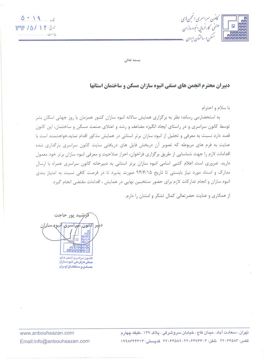 به اطلاع انبوه سازان محترم می رساند انجمن صنفی انبوه سازان مسکن و ساختمان استان آذربایجان شرقی در نظر دارد برترین های انبوه سازی استان را در دو بخش انبوه سازی شخصی و مسکن مهر انتخاب نموده و جهت معرفی و تجلیل در همایش سالانه انبوه سازان کشور که همزمان با روز جهانی اسکان بشر در تاریخ 13 مهرماه 94 برگزار خواهد گردید به کانون سراسری انبوه سازان مسکن و ساختمان ایران معرفی نماید.