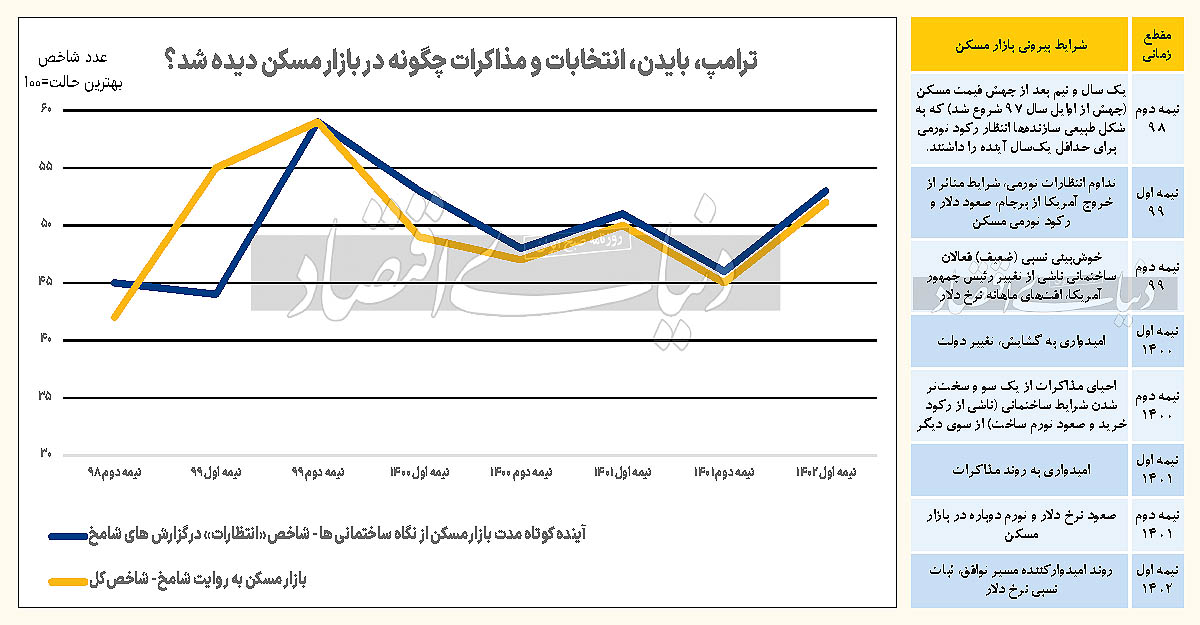 برای پاسخ به این دو سوال، مشخصات 8 مقطع زمانی بازار مسکن (‌نیمه دوم 98 تا نیمه اول 1402)، تحت‌تاثیر تغییر و فراز و فرودهای کارگردان اصلی بازار یعنی متغیرهای بیرونی و سپس مولفه‌‌‌‌های درونی، مورد بررسی قرار گرفته است. در این 8 مقطع زمانی، کارگردان اصلی، موج برجامی موثر بر بازار مسکن بوده است. موجی که به دنبال بروز دو سیاست و دو رویکرد متفاوت از سوی دو رئیس‌‌‌‌جمهور سابق و فعلی آمریکا با اثرگذاری بر فراز و فرودهای ریسک‌‌‌‌های غیراقتصادی، نوسانات دلاری و نوسانات ملکی، به ریسک‌‌‌‌های سرمایه‌‌‌‌گذاری ملکی، انتظارات و رفتارهای سازنده‌‌‌‌ها جهت داده است. سیاست‌‌‌‌های ترامپ در مورد ایران و خروج او از معاهده برجام، پیروزی بایدن در انتخابات ریاست جمهوری آمریکا و احیای مذاکرات برجام، اثر نوسان‌‌‌‌های دلاری ناشی از موج‌‌‌‌های مختلف برجامی و سرایت این آثار به بازار مسکن و سرمایه‌‌‌‌گذاری ملکی در کنار مولفه‌‌‌‌هایی مانند تورم ساختمانی که از داخل بازار رفتار سازنده‌‌‌‌ها را در این 47 ماه جهت داده است، مهم‌ترین عوامل موثر بر سطح انتظارات و عملکرد سمت عرضه مسکن در این 8 مقطع زمانی است.  در یک نمونه مشخص، دی ماه سال 99 دو ماه بعد از انتخاب بایدن به عنوان رئیس جمهور آمریکا، شاخص مربوط به انتظار سازنده‌‌‌ها از آینده کوتاه‌‌‌مدت فعالیت‌‌‌های ساختمانی(یک ماه بعد)، روی عدد 67 قرار گرفت. در بهمن همان سال، عدد مربوط به وضعیت واقعی بازار که ماه قبل 58 بود به 64 رسید. یعنی در وضعیت خوش‌بینی صعود کرد و به پیش‌بینی سازنده‌ها نزدیک شد.