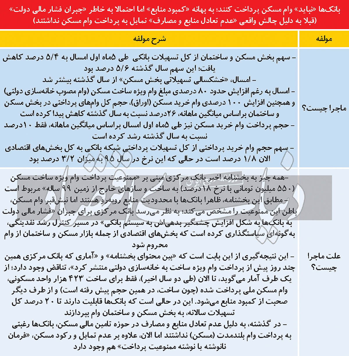 اما این نتیجه‌‌‌گیری از این بابت است که «بین محتوای بخشنامه» و «آماری که بانک مرکزی همین چند روز پیش از پرداخت وام ویژه ساخت به خانه‌‌‌سازی دولتی منتشر کرد»، تناقض وجود دارد؛ از یک طرف آمار می‌‌‌گوید، تا الان (طی دو سال اخیر)، فقط برای ساخت 423‌هزار واحد مسکونی، وام مسکن ملی پرداخت شده (چون ساخت، در همین حجم پیش رفته است) و از طرف دیگر صحبت از کمبود منابع می‌شود. این در حالی است که بانک‌ها قابلیت دارند تا 20‌درصد کل تسهیلات سالانه، به بخش مسکن و ساختمان وام بپردازند.