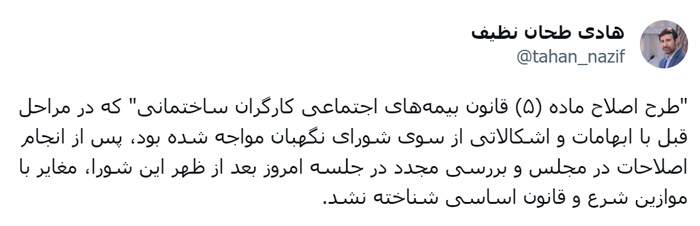به گزارش روابط عمومی انجمن انبوه سازان مسکن و ساختمان آذربایجان شرقی به نقل از  پایگاه اطلاع رسانی شورای نگهبان، دکتر طحان نظیف، سخنگوی شورای نگهبان، در حساب توییتری خود نوشت: