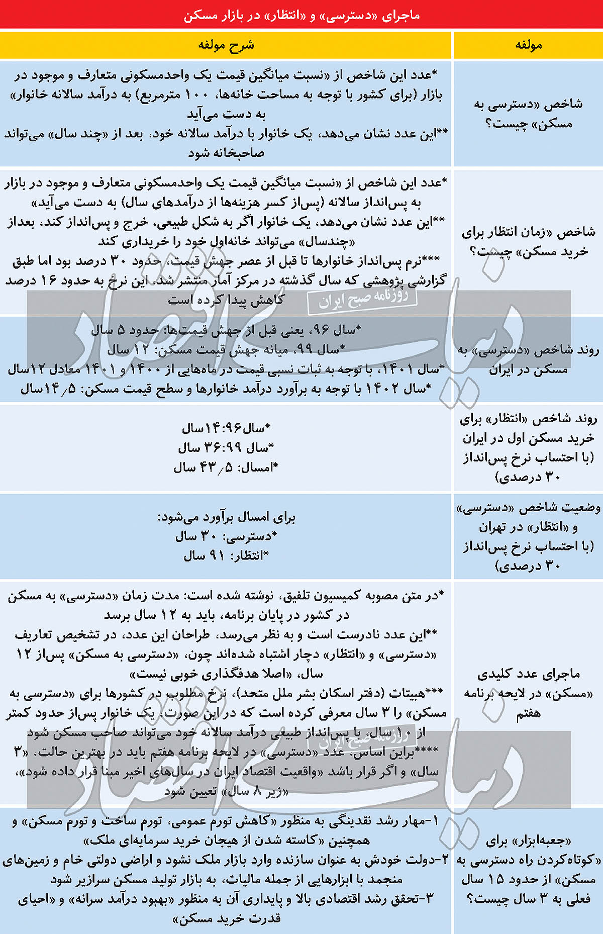 البته این یک برآورد در نبود آمار رسمی از میانگین قیمت مسکن کشوری است که «دنیای‌اقتصاد» با در نظر گرفتن یک واحد مسکونی 100 مترمربعی با میانگین سنی 13 تا 15 سال ساخت انجام داده است. بر این اساس متوسط قیمت هر مترمربع آپارتمان مسکونی در کشور حدود 28 میلیون تومان برآورد می‌شود و زمان انتظار و شاخص دسترسی به مسکن نیز بر این اساس محاسبه شده است. حالا اما یک عدد کلیدی در لایحه برنامه هفتم توسعه گنجانده شده است، مبنی بر اینکه شاخص دسترسی به مسکن در کشور ظرف مدت پنج سال به 12 سال برسد. اما این عدد نادرست به نظر می‌رسد چراکه همین حالا شاخص مذکور برای یک واحد میانسال 100 مترمربعی 14.5 سال است و کاهش آن به 12 نمی‌تواند هدف‌گذاری مطلوبی باشد.