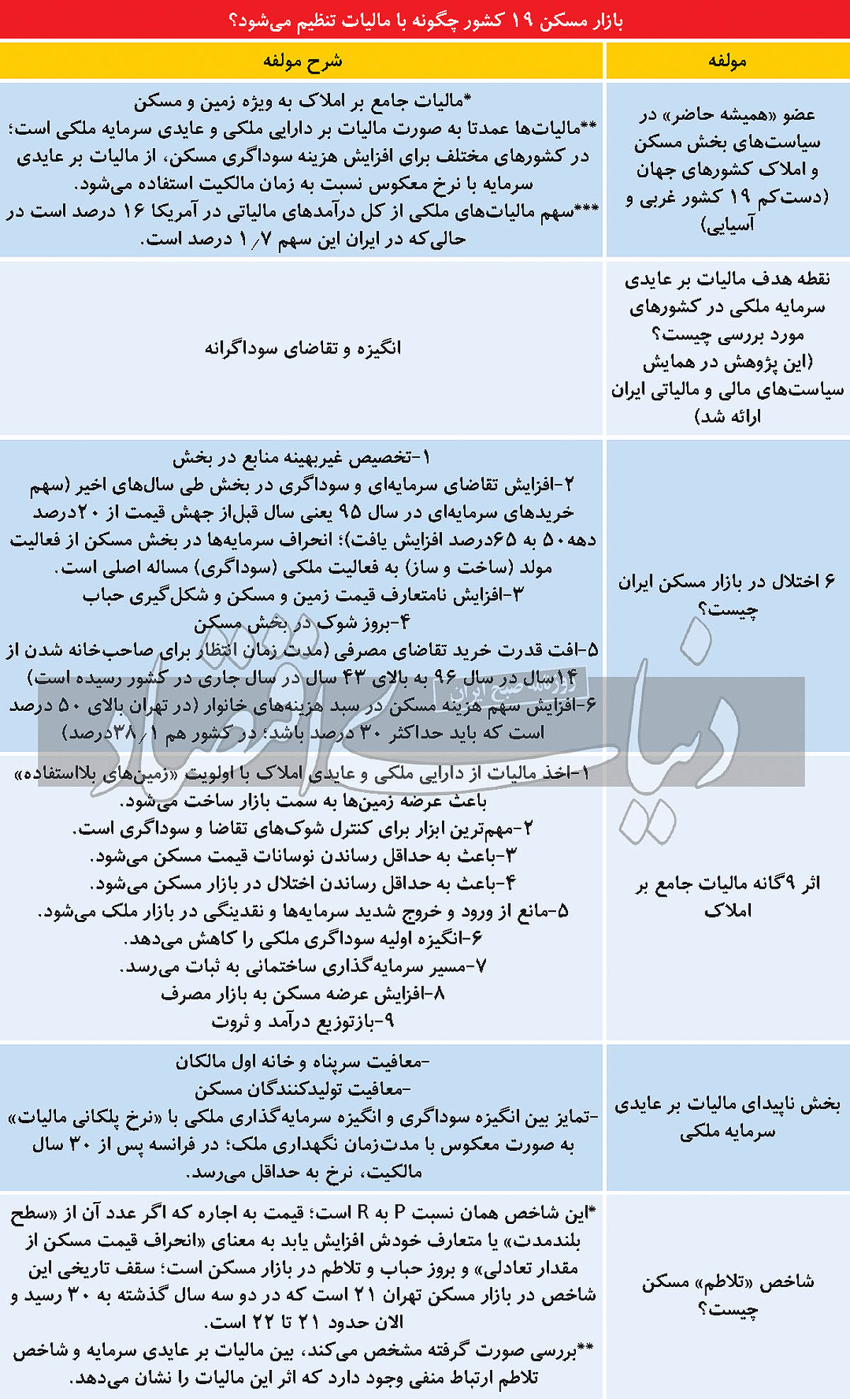 راهکار موثری که مطالعه مذکور برای سامان‌‌‌بخشی به مسکن معرفی می‌‌‌کند، ایجاد یک نظام مالیات بر املاک کارآمد است؛ تجربه‌‌‌ای که در کشورهای زیادی تجربه شده و نتیجه‌‌‌بخش بوده است. آمریکا، انگلستان، آلمان، فرانسه، اسپانیا، دانمارک، ایرلند، کانادا، آرژانتین، برزیل، شیلی، استرالیا، کره‌جنوبی، چین، هنگ‌کنگ، سنگاپور، هند، ترکیه و بولیوی از جمله کشورهایی هستند که نسخه مالیاتی موثری برای ایفای نقش تنظیم‌‌‌گری در بازار مسکن در آنها پیاده شده و می‌تواند برای سیاستگذار بخش مسکن در کشور ما نیز الهام‌‌‌بخش باشد.