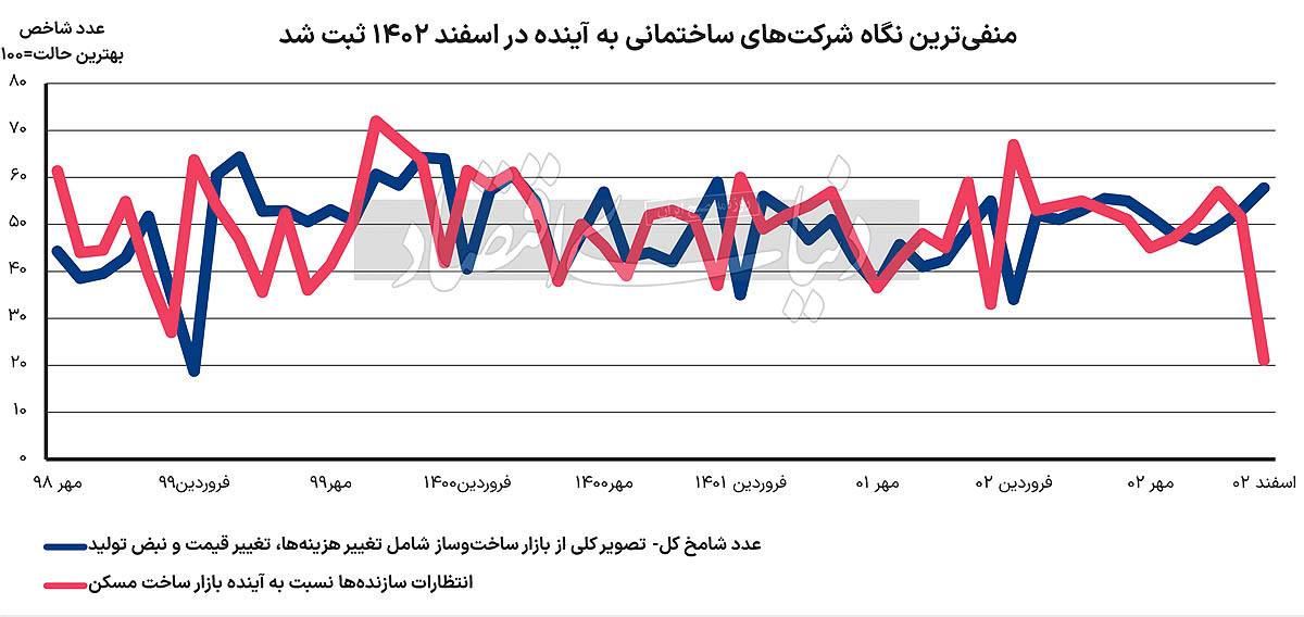 از سوی دیگر، شاخص بیان‌‌‌کننده وضعیت «قیمت مصالح‌‌‌ساختمانی» شرایط حادتر را در اسفند پیدا کرد و روی عدد 69 قرار گرفت؛ این موضوع نیز به خاطر بروز تورم در بازار مصالح بود. بررسی‌‌‌ها نشان می‌‌‌دهد،  شاخص «انتظارات سازنده‌‌‌ها نسبت به سال 1403» در اسفند سال گذشته، پایین‌‌‌ترین عدد در طول انتشار گزارش‌‌‌های شامخ را ثبت کرد و روی عدد 21 قرار گرفت.