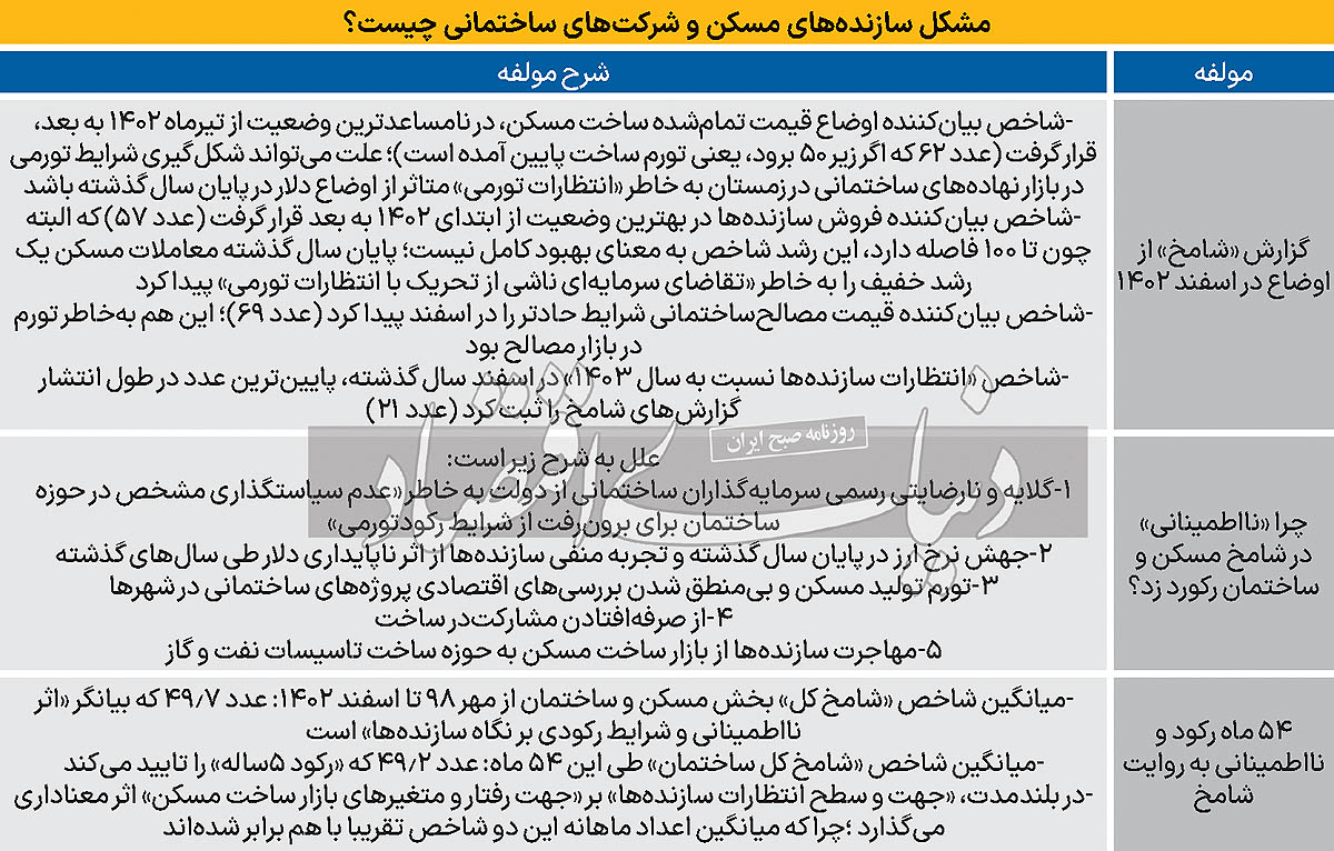 گزارش اسفند ماه و جدول نمرات شاخص‌‌‌های مورد بررسی در گزارش اسفند ماه شامخ بخش ساختمان نشان می‌‌‌دهد، شاخص بیان‌‌‌کننده «اوضاع قیمت تمام‌‌‌شده ساخت مسکن»، در بدترین وضعیت از تیرماه 1402 به بعد، قرار گرفته است. عدد مربوط به این شاخص 62 گزارش شده است که اگر زیر 50 برود، یعنی تورم ساخت پایین آمده است و هرچه بالاتر برود نشان دهنده افزایش سرعت رشد قیمت تمام شده ساخت مسکن است. بررسی‌‌‌های دنیای اقتصاد نشان می‌‌‌دهد علت این موضوع می‌‌‌تواند شکل‌‌‌گیری شرایط تورمی در بازار نهاده‌‌‌های ساختمانی در زمستان به‌خاطر «انتظارات تورمی» متاثر از اوضاع دلار در پایان سال گذشته باشد.