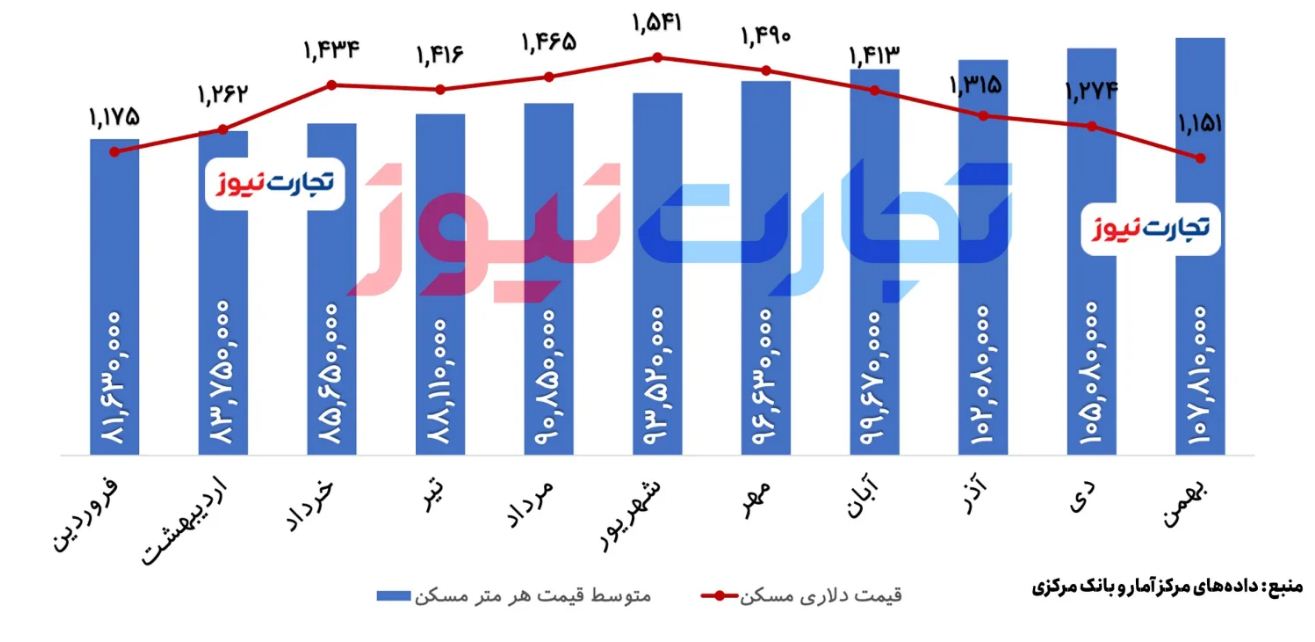 متوسط قیمت مسکن در فروردین سال جاری طبق گزارش بانک مرکزی، به متری ۸۱ میلیون و ۶۳۰ هزار تومان رسیده بود. بررسی‌ها نشان می‌دهد با در نظر گرفتن دلار ۶۹ هزار و ۵۰۰ تومانی در این ماه، قیمت دلاری مسکن در فروردین حدود ۱۱۷۵ دلار برای هر متر بوده است.