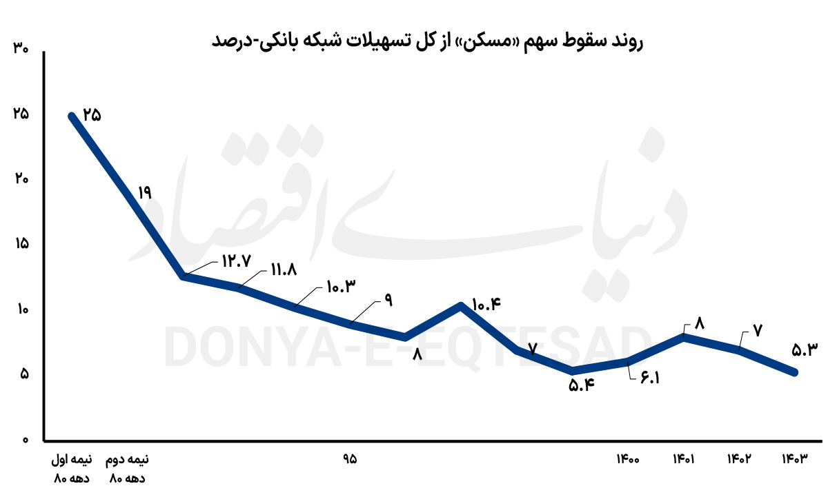 بررسی‌‌ها حاکی از آن است که سهم تسهیلات بانکی از کل تسهیلات بخش مسکن کشور در سال 1403 به 5.4‌درصد رسید؛ این درحالی است که در نیمه ابتدایی دهه 80 سهم بخش مسکن از کل تسهیلات بانکی 25‌درصد بود و در نیمه دوم این دهه نیز این سهم به حدود 20‌درصد کاهش یافت. طی دهه 90 و سال‌های اخیر تقریبا به شکل مستمری از سهم بخش مسکن از کل تسهیلات بانکی کاسته شد؛ در سال 1402 سهم بخش مسکن از کل تسهیلات بانکی 7 و در سال 1401 این سهم برابر 8درصد بود. افت سهم بخش مسکن از کل تسهیلات بانکی کشور طی سال‌های اخیر به مفهوم کارنامه مردودی بخش مسکن از دریافت تسهیلات بانکی است.  بلندمدت بودن زمان بازپرداخت تسهیلات مسکن در کشور نسبت به سایر تسهیلات و تعیین نرخ بازپرداخت به شکل دستوری بدون هرگونه حمایت دولت از بانک‌های اعطاکننده این وام باعث شده تا اغلب بانک‌ها تمایلی به پرداخت این تسهیلات نداشته باشند.