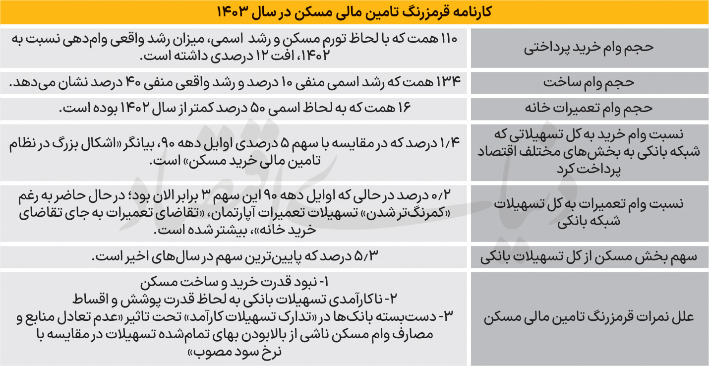 میزان تسهیلات اعطایی به بخش ساخت‌‌وساز نیز در سال 1403 به رقم 134 همت رسید؛ این رقم نسبت به میزان اسمی تسهیلات اعطا شده در سال 1402 کاهشی 10 درصدی داشت. در عین حال با توجه به در نظر گرفتن تورم 30 درصدی در بخش ساخت‌‌وساز می‌توان این‌گونه ادعا کرد که تسهیلات واقعی اعطا شده به بخش ساخت مسکن در سال 1403 نسبت به سال قبل افتی 40 درصدی داشته است. کاهش محسوس اعتبار واقعی تخصیص یافته به بخش ساخت‌‌وساز، در سال گذشته، رکود در این صنعت را به دلیل چالش تامین مالی، تشدید کرد.
