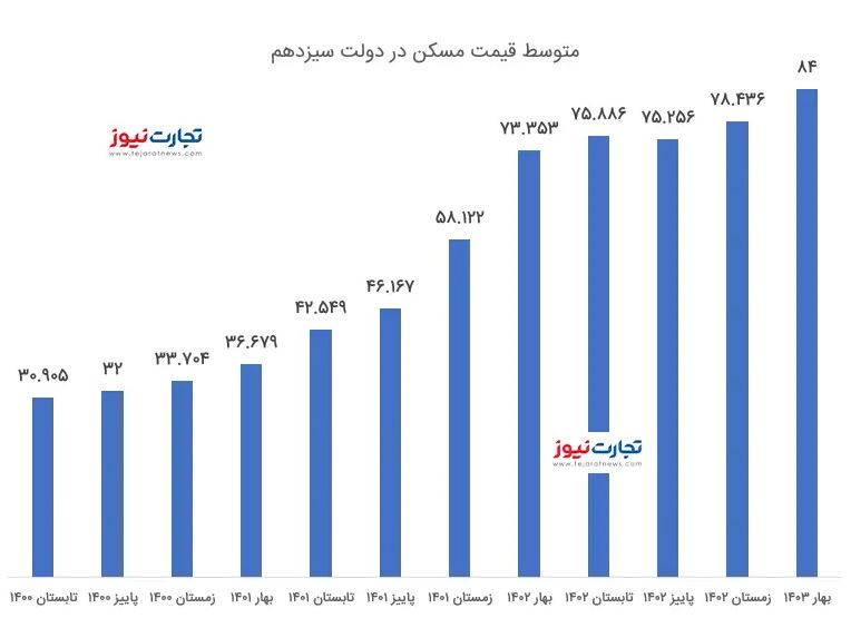 فعالیت دولت سیزدهم از تابستان 1400 آغاز شد؛ در این فصل، متوسط قیمت مسکن تهران متری 30 میلیون و 905 هزار تومان ثبت شده که این عدد تا زمستان 1400 به متری 33 میلیون و 704 هزار تومان رسیده است.