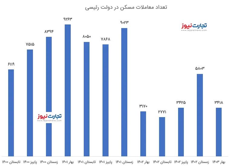 از سوی دیگر با وجود اینکه زمستان 1402 معاملات مسکن رونقی نسبی را تجربه کرده‌اند، اما این تجربه چندان ماندگار نبوده و در فصل بعد، یعنی بهار 1403 معاملات بار دیگر با افت چشمگیری روبه‌رو بوده است. رشد معاملات مسکن در زمستان 1402 را نیز البته باید به چشم‌انداز تورمی درباره قیمت دلار مرتبط دانست که در آستانه نوروز 1403 بار دیگر در کانال 60 هزار تومانی نشسته بود.