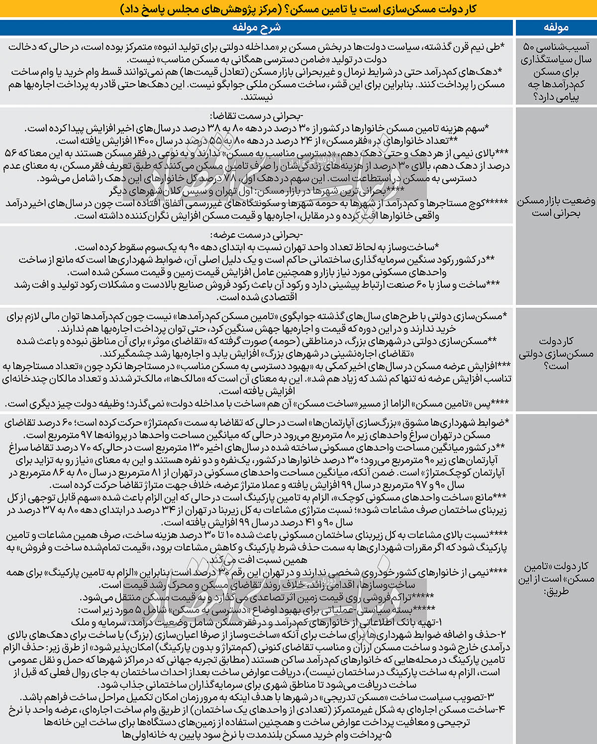 در آستانه روی کار آمدن دولت چهاردهم مرکز پژوهش‌‌های مجلس گزارشی با عنوان «بسته سیاستی-عملیاتی تامین مسکن گروه‌‌های کم‌‌درآمد» را منتشر کرد که در آن ضمن عیب‌‌یابی طرح‌‌های پیشین اجرایی شده به‌‌منظور افزایش دسترسی آحاد جامعه به مسکن مناسب به ارائه راهکار در این خصوص پرداخت. این گزارش 5 گام اصلی در زمینه گسترش دسترسی افراد کم‌‌درآمد به مسکن ارائه می‌کند؛ جمع‌‌آوری بانک اطلاعاتی دقیق از خانوارهایی که برای تامین مسکن به حمایت مستقیم دولت نیاز دارند گام ابتدایی است. ساخت مسکن و تشویق به اجاره‌‌های بلندمدت گام دوم برای کاهش چالش افراد در تامین خانه است. اصلاح قوانینی که مانع سرمایه‌گذاری در بازار مسکن شده‌‌اند نظیر حذف الزام به تامین 100‌درصد پارکینگ و کاهش متراژ حداقلی بنا پیشنهاد بعدی مطرح شده در این گزارش است. همچنین در این گزارش تاکید می‌شود که در مناطق ضعیف، خانه‌‌های غیراعیانی ساخته شوند تا به این ترتیب با کاهش هزینه تولید، دسترسی افراد به خانه تسهیل شود. اعطای وام‌‌های بلندمدت برای اقشار متوسط نیز اقدام بعدی موثر جهت‌‌ خانه‌‌دار شدن دهک‌‌های درآمدی متوسط است.