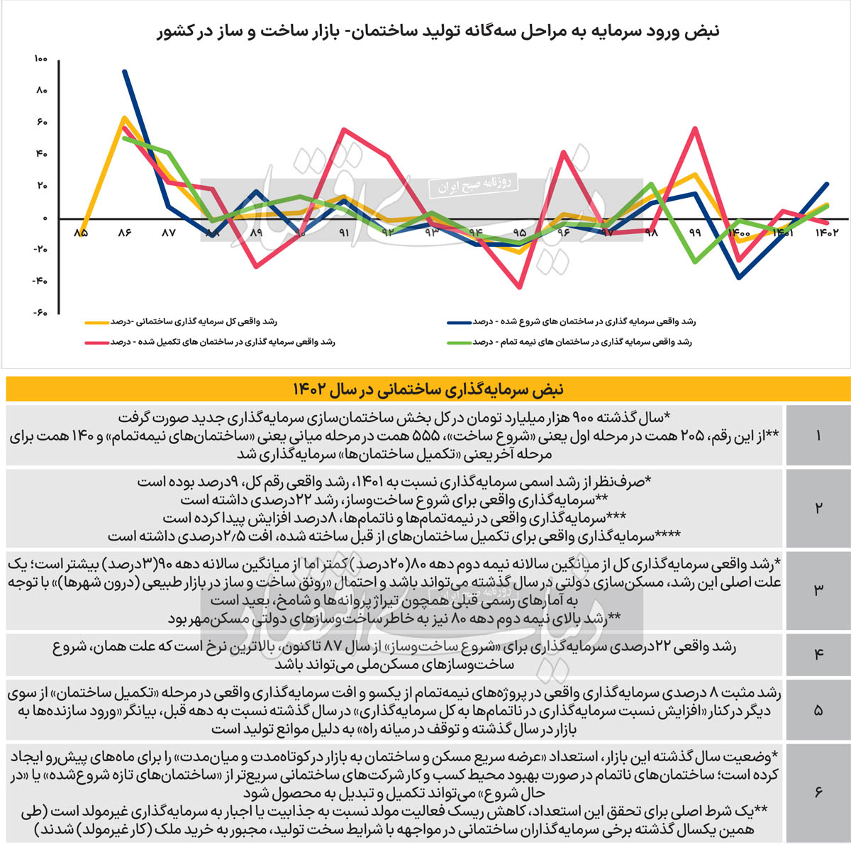 گزارش «دنیای‌اقتصاد» از آمار رسمی سرمایه‌گذاری ساختمانی در سال گذشته حاکی است، مجموع سرمایه‌گذاری صورت گرفته در طول خط‌‌ تولید مسکن و ساختمان به لحاظ «رشد واقعی»، 9‌درصد نسبت به 1401 افزایش پیدا کرد. خط تولید مسکن شامل سه مرحله سرمایه‌گذاری برای «شروع ساخت‌‌وساز»، سرمایه‌گذاری برای «پیشرفت‌‌ فیزیکی ساختمان‌‌های در حال ساخت و ناتمام» و در نهایت سرمایه‌گذاری برای «تکمیل ساختمان» جهت عرضه به بازار فروش است. نرخ افزایش واقعی کل سرمایه‌گذاری در ساخت‌‌وسازهای 1402، با توجه به «رشد مثبت میانگین 4.8 درصدی در سال‌های عصر جهش قیمت‌ها (سال‌های 97 تا 1401)» و همچنین «رشد مثبت میانگین 3 درصدی طی سال‌های دهه 90»، از نوعی «تغییر مثبت در اوضاع بازار ساخت» طی 1402 حکایت دارد.