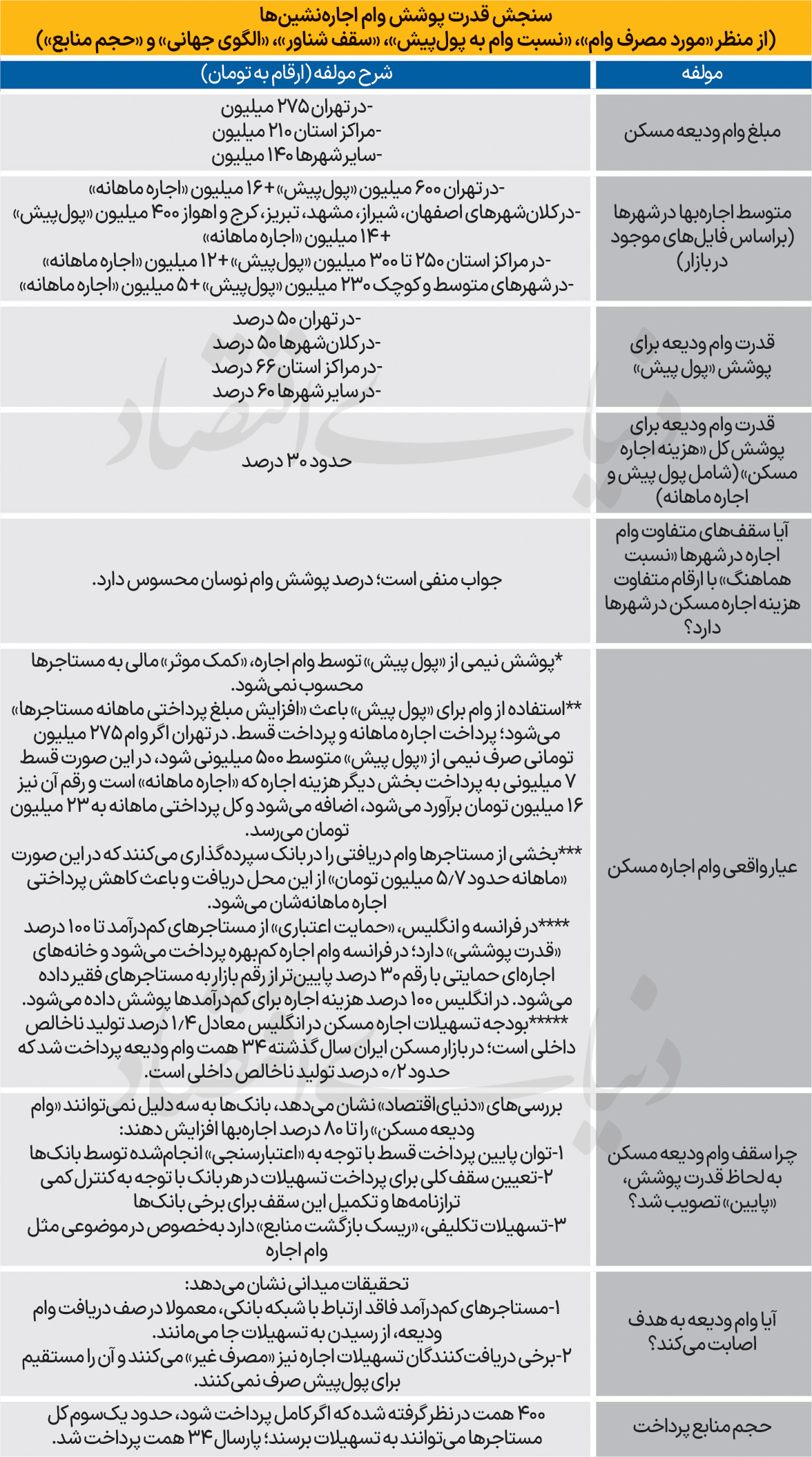 بررسی موردی هزینه اجاره، وام و میزان قدرت پوشش آن در پول پیش، نشان میدهد، سقف جدید وام اجاره مسکن در تهران، مراکز استان و شهرهای کوچک تنها قدرت پوشش نصف پول پیش را دارد و سقفهای وام اجاره در شهرها با «اختلاف شهری اجارهبها» هماهنگی ندارد و درصد پوشش وام، نوسان محسوسی دارد. این سقف تسهیلات ودیعه در تهران و کلانشهرها حدود 50 درصد، در مراکز استانی 66 درصد و شهرهای کوچک 60 درصد «پول پیش» را پوشش میدهد. بررسی دقیقتر حاکی از آن است که قدرت وام ودیعه برای پوشش کل «هزینه اجاره مسکن» یعنی پول پیش و اجاره ماهانه تنها حدود 30 درصد را شامل میشود.