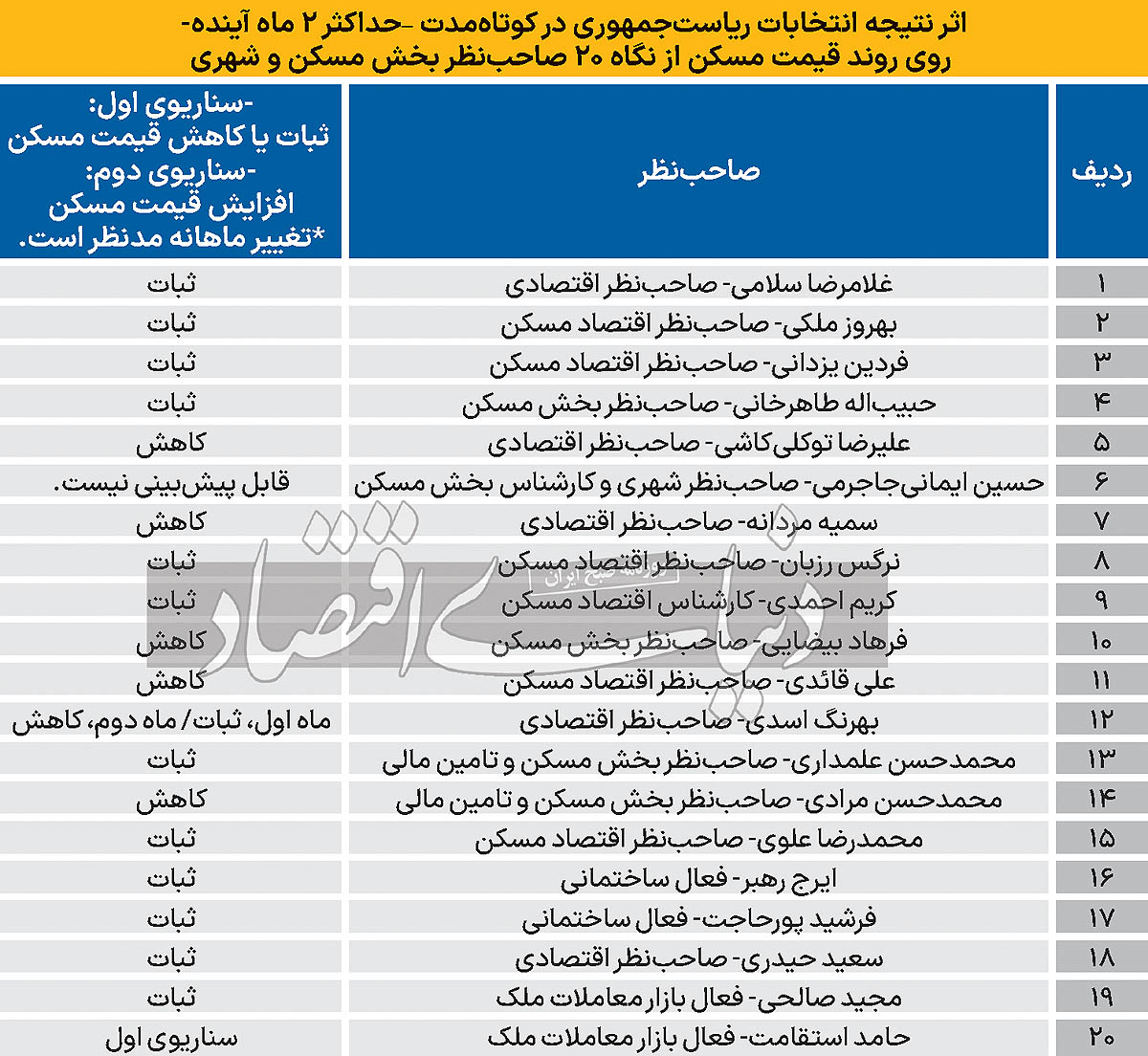 به این ترتیب باید اذعان کرد که برآیند نظر فعالان اقتصادی از تاثیر نتیجه انتخابات بر بازار مسکن در کوتاه‌مدت حکایت از آرامش نسبی و ثبات قیمتی دارد. اما در خصوص آینده میان‌مدت و بلندمدت این بازار و اینکه عصر پسا‌جهش مسکن شکل پایدار گرفته یا خیر باید منتظر اعلام کابینه دولت چهاردهم، مشخص شدن ریز‌برنامه‌‌‌های اقتصادی و سیاست خارجی این دولت و همچنین چگونگی  اجرای برنامه‌‌‌ها در این دولت باشیم.
