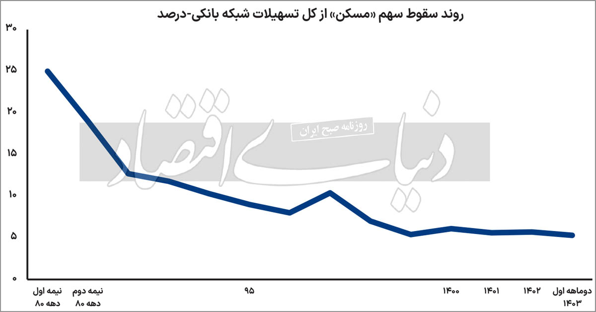 بررسی‌‌های «دنیای‌اقتصاد» نشان می‌دهد، سهم وام خرید مسکن از کل تسهیلات پرداختی شبکه ‌‌بانکی به همه بخش‌‌های اقتصادی در دو ماه اول امسال به 1.5‌درصد سقوط کرده است در حالی که این سهم در سال 1402 به میزان 1.8‌درصد بوده است. این یعنی آنکه، وزن تامین مالی گران‌ترین خرید مصرفی خانوارها در عملکرد شبکه‌‌بانکی، ضعیف‌‌تر از قبل شده است. نیمه دهه 90 این سهم 5‌درصد بوده است.