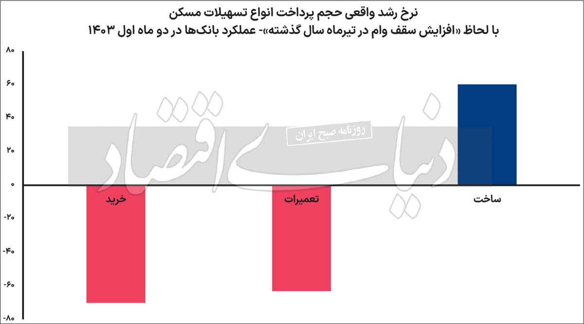 آنچه این سناریو را تقویت می‌کند، «میزان رشد ۳ رقمی تسهیلات ساخت پرداخت‌‌شده» طی همین بازه زمانی است. در دو ماه اول امسال ۲۶‌هزار میلیارد تومان وام ساخت توسط بانک‌ها به سازنده‌‌ها پرداخت شده که در مقایسه با دو ماه اول سال گذشته، ۱۶۰‌درصد افزایش از خود نشان می‌دهد. این یعنی، در دو ماه اول امسال، بیش ‌‌از نصف همه تسهیلات مسکن، تنها به بخشی از ساخت‌‌وسازها داده شد. در مقابل «جهش وام‌‌دهی به ساخت مسکن»، رشد محدود تسهیلات‌‌دهی برای خرید و تعمیر خانه قرار دارد که به ترتیب در این بازه زمانی، ۲۸‌درصد و ۳۷‌درصد افزایش اسمی پیدا کرده است.