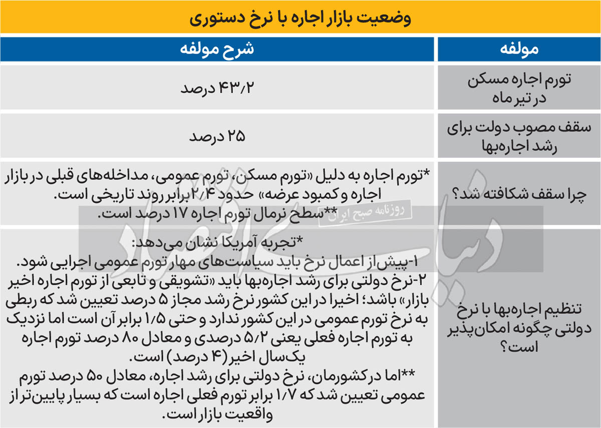 معاملات اجاره مسکن در تیرماه عملا «سقف دولتی 25‌درصد رشد اجاره‌‌‌بها» را رد کرد. هر‌چند احتمال دارد برخی ناظران بازار بگویند، این مصوبه در اواخر نیمه اول ماه تیر ابلاغ شد، اما دست‌‌‌کم در تهران از ابتدای تیر ماه، همین نرخ از سوی مقامات اعلام شده بود و اثر روانی خود را بر رفتارهای معاملاتی گذاشت. علت اینکه «نرخ 25 درصد» مورد توجه یا پذیرش معامله‌‌‌گران بازار کشوری اجاره مسکن قرار نگرفته، «ایراد فنی» در فرمول محاسبه این نرخ است که چون طراحان، «ظاهر تجربه‌‌‌های جهانی تنظیم بازار اجاره به نرخ دولت» را دیده‌‌‌اند و از «عمق ماجرا» بی‌‌‌اطلاع هستند، این اشکال بروز کرد و نتیجه‌‌‌اش، عبور از سقف شد. در ماده 7 قانون ساماندهی بازار زمین، مسکن و اجاره‌‌‌بها مصوب شده است، «رشد مجاز سالانه اجاره‌‌‌بها براساس «ضریبی از تورم عمومی سالانه» تعیین شود به این صورت که نرخ رشد اجاره‌‌‌بها حداکثر معادل 100‌درصد تورم باشد.»