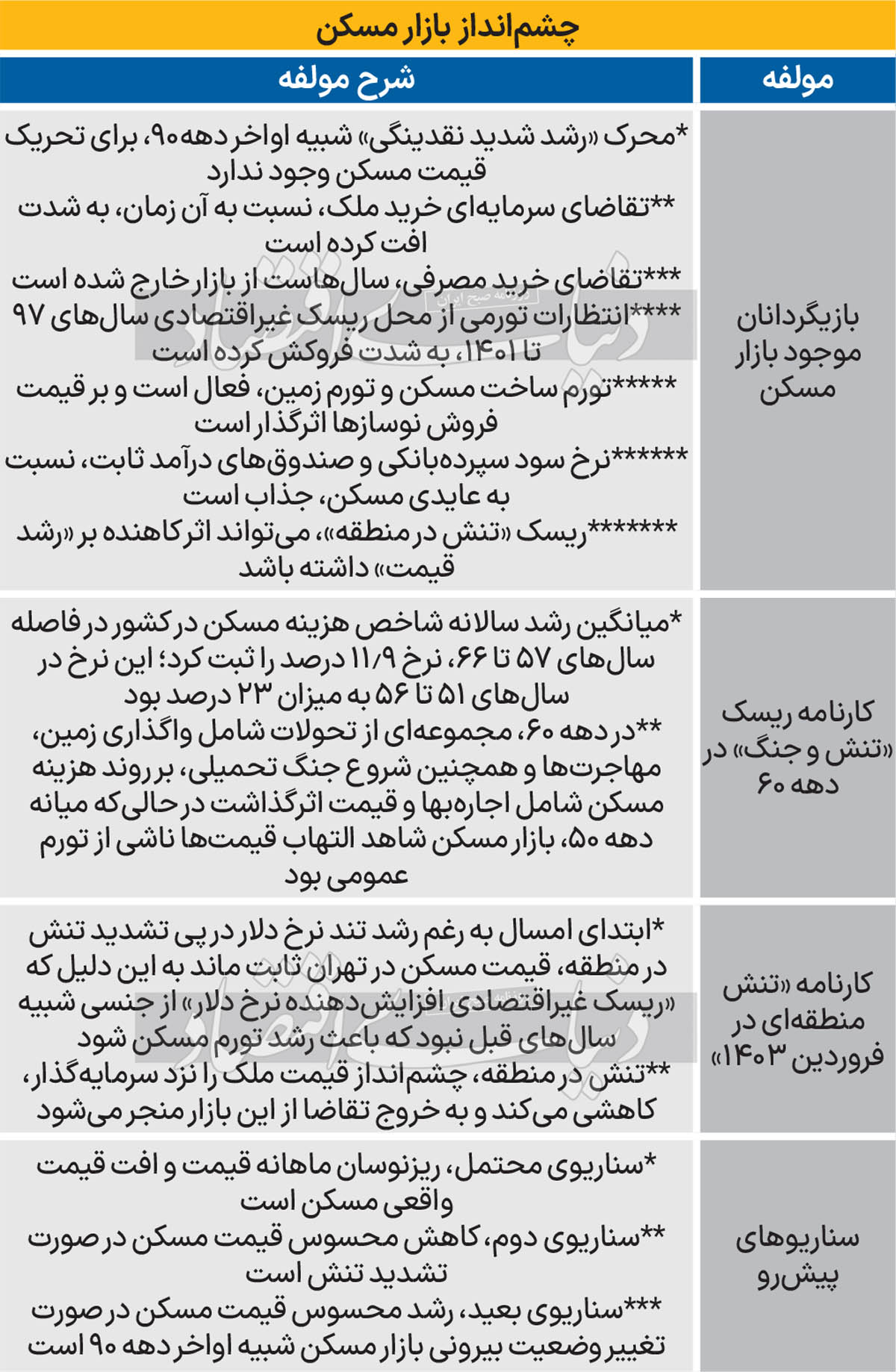 از تابستان سال 1402، تا حدود زیادی، آن دو عامل (ریسک برجام و نقدینگی) فروکش کرد و بازار مسکن تحت‌تاثیر «افت شدید انتظارات تورمی در آن مقطع از محل شروع و تداوم مذاکرات برای دستیابی به توافق با غرب از یکسو و کاهش التهاب نرخ رشد نقدینگی از سوی دیگر» قرار گرفت. در تابستان سال گذشته قیمت مسکن، ماه به ماه با کاهش روبه‌رو شد و ثبات نسبی (آرامش) قیمت مسکن در پاییز نیز ادامه پیدا کرد. اما نیمه دوم سال گذشته، بازار شاهد «بروز آثار ناشی از تنش منطقه‌‌ای» مرتبط با تجاوز اسرائیل به غزه شد؛ این فاکتور به عنوان «بازیگردان جدید» و با «اثر متفاوت» در معادلات بازار مسکن خودنمایی کرد.