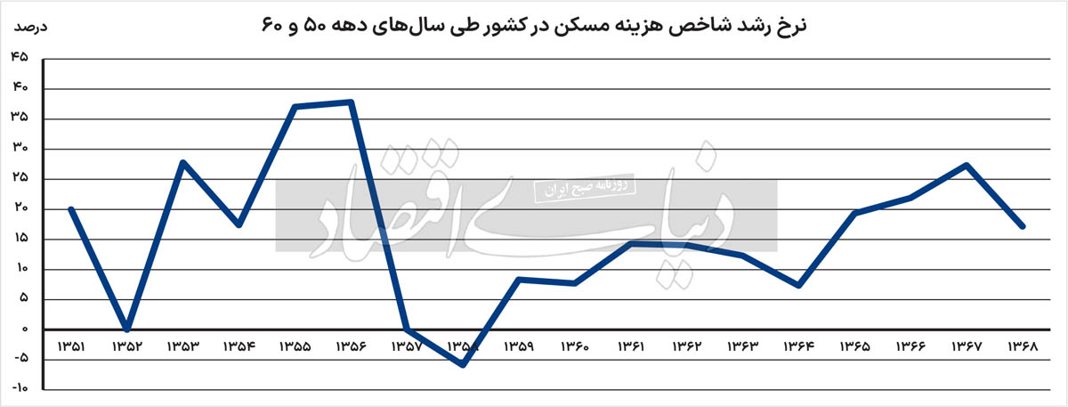 هر چند در سال 58، نرخ رشد این شاخص، منفی 5.8‌درصد بود اما آن رشد منفی ناشی از «بهبود روند صاحب‌‌خانه شدن در آن مقطع به خاطر همان واگذاری‌‌ها و افزایش ناگهانی عرضه» بوده است. به این ترتیب، رشد کمتر از 10 درصدی شاخص هزینه مسکن در سال 59 و همین رشد محدود در سال 60 را باید با دوره «التهاب قیمت‌ها در میانه دهه 50» که خبری از مداخله حمایتی دولت در بازار مسکن و فاکتورهای مقطعی نبود، مقایسه کرد تا مشخص شود فاکتور جنگ چگونه بر روند بازار اثر گذاشته است. شاید هم بهتر باشد، رشد شاخص هزینه مسکن در فاصله سال‌های 50 تا 56 با دوره 57 تا 68 مقایسه شود که در این صورت مشخص می‌شود، میانگین رشد سالانه 23‌درصد در مقطع اول به 11‌درصد در مقطع دوم کاهش پیدا می‌کند.
