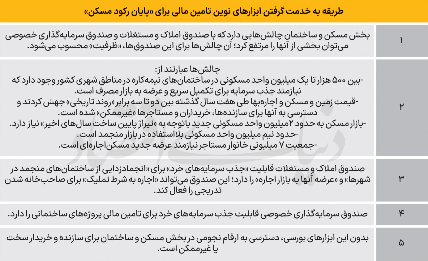 به گزارش روابط عمومی انجمن انبوه سازان مسکن و ساختمان آذربایجان شرقی، درون بخش رکودزده مسکن، از یک‌‌سو «عایدی بلندمدت بالا (نسبت به بازارهای موازی) برای سرمایه‌‌گذار، حجم قابل توجه ساختمان نیمه‌‌کاره و املاک فروش‌‌نرفته، تقاضای انباشت خرید خانه، جمعیت زیاد اجاره‌‌نشین‌‌ها و جاماندگی روند سرمایه‌‌گذاری ساختمانی از نیاز بازار» به عنوان مختصات وضع موجود ظرفیت‌‌های رونق مطرح است و از سوی دیگر، «عدم تناسب بین توان مالی و اعتباری تضعیف‌‌شده دو سمت عرضه و تقاضا با بودجه مورد نیاز برای ساخت و تامین مسکن» به عنوان نقطه‌‌ضعف این مختصات، جلوی «خروج از رکود» را سلب کرده است. بیرون این مختصات اما دو ابزار نوین مالی و متکی به بازار سرمایه فعال است که در صورت اتصال به بازار مسکن و ساخت‌‌وساز، شرایط این بخش را تاحدودی متحول خواهد کرد. در این زمینه، حسین بریهی، کارشناس ارشد تامین مالی مسکن پژوهشی برای طراحی مدل‌های تامین مالی ممکن و سازگار با اوضاع مسکن انجام داده و دست‌‌کم دو ابزار تامین مالی شامل «صندوق املاک و مستغلات» و «صندوق سرمایه‌‌گذاری خصوصی» را مناسب استفاده برای «خروج از رکود مسکن» معرفی کرده است.