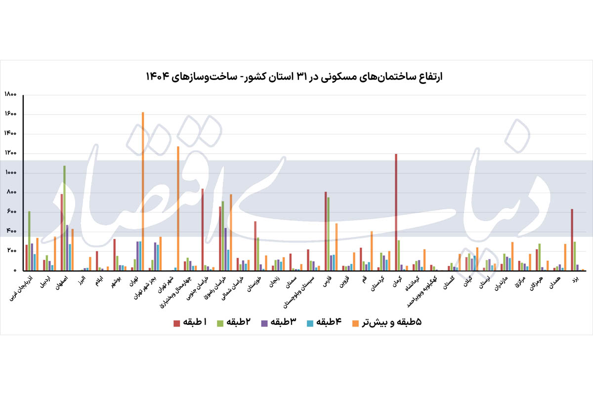 در استان‌هایی که صاحب کلان‌شهر هستند مثل اصفهان و البرز، تعداد ساختمان‌های ۵طبقه و بیشتر، بسیار پایین است؛ در اصفهان، این سهم، ۱۴ درصد و در البرز ۷ درصد است.