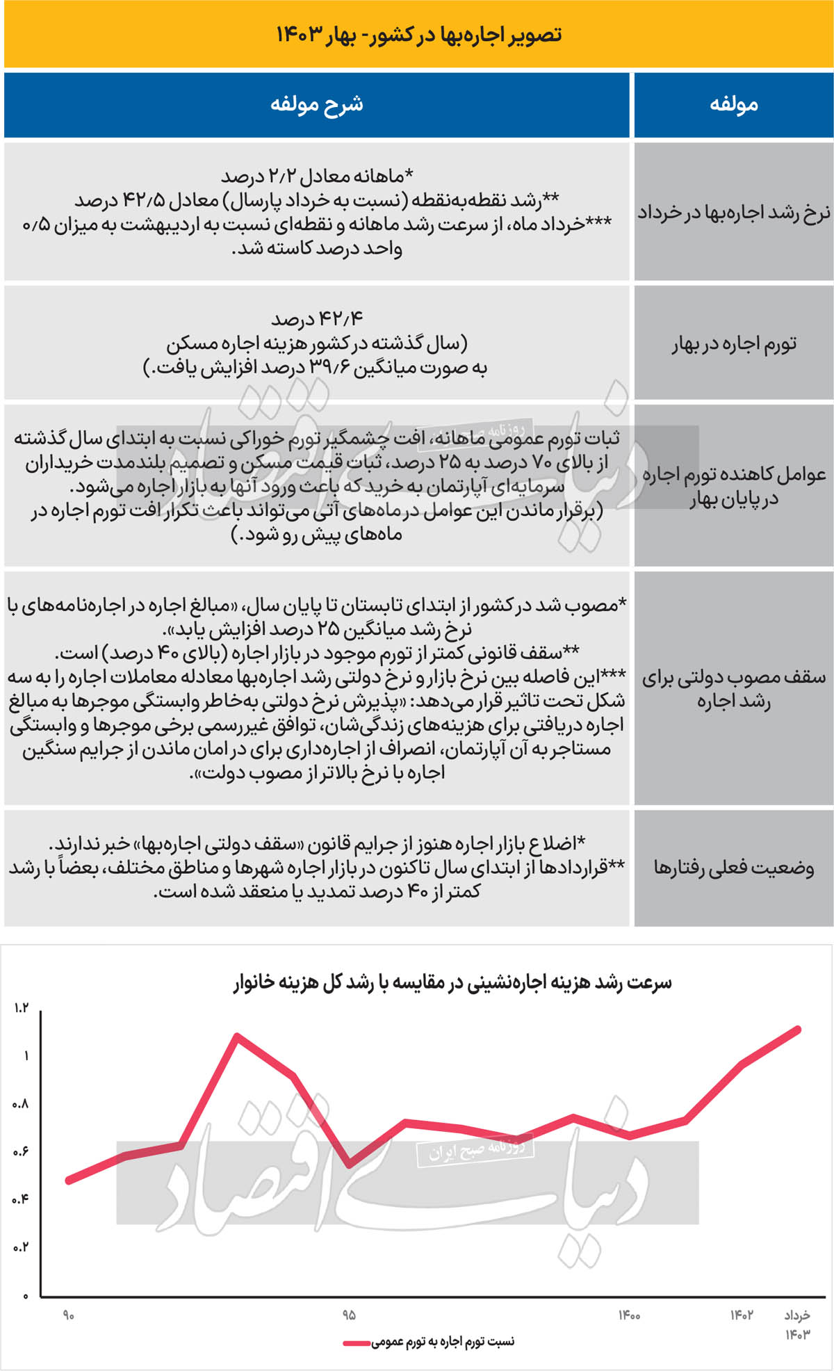 این رشد بالای 40 درصدی اجاره‌‌‌بها در قراردادهای 1403 نسبت به مبالغی که مستاجرها در 1402 پرداخت می‌‌‌کردند، به لحاظ «عدم‌تناسب با رشد درآمد خانوارهای مستاجر در سال‌جاری» باعث شده فشار هزینه‌‌‌ای آپارتمان‌‌‌ اجاره‌‌‌ای از آستانه تحمل مالی‌‌‌ بخش قابل‌توجهی از اجاره‌‌‌نشین‌‌‌ها خارج شود. با این حال، کاهش جزئی همین سطح فشار در ماه گذشته و شناسایی عوامل مهار آن، می‌تواند برای سیاستگذار «درس» باشد از بابت اینکه «شرایط بیرونی بازار اجاره در ماه‌‌‌های آتی» را در مسیری قرار دهد که «تورم اجاره از کانال 40‌درصد به سطح نرمال، یعنی کانال 20‌درصد کاهش یابد» تا بلکه «اجاره‌‌‌بها به محدوده استطاعتی خانوارهای مستاجر برگردد.» سال گذشته اجاره‌‌‌بها در کشور به صورت میانگین 39.6‌درصد افزایش یافته بود اما بهار امسال میانگین رشد نسبت به بهار سال گذشته 42.4‌درصد بوده است.