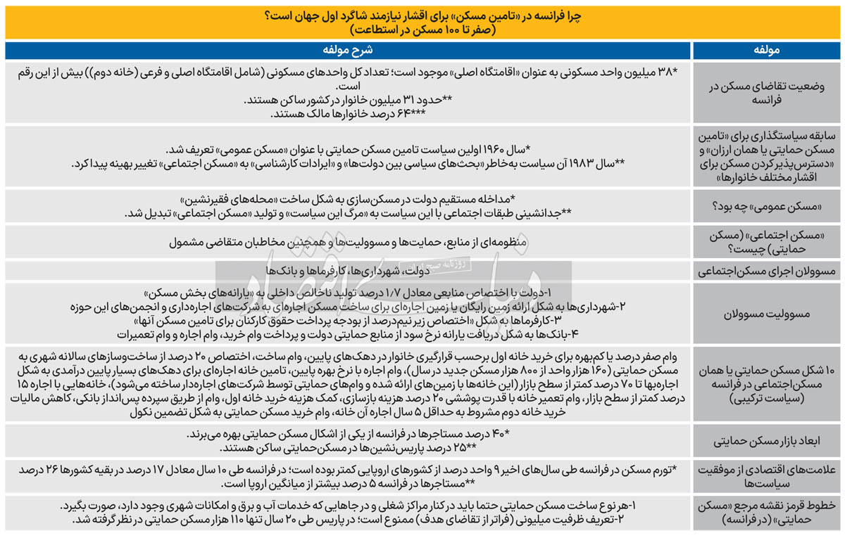 «دنیای‌اقتصاد» در آستانه شروع فعالیت دولت چهاردهم، فرانسه را برای «درس گرفتن در حوزه تامین مسکن حمایتی» انتخاب کرد به یک علت کلیدی؛ فرانسه در بین کشورهای غربی و همچنین سیاست‌‌‌های جهانی توصیه‌‌‌شده به سایر کشورها، به «موفق‌‌‌ترین کشور در ارائه مسکن در استطاعت» مشهور است. سیاستگذاران مسکن در خیلی از کشورها، فرانسه را به «مسکن‌‌‌اجتماعی» می‌‌‌شناسند. ضمن آنکه، ‌‌‌ علامت‌‌‌های اقتصادی مشخص و مستند از «تفاوت اقتصاد مسکن فرانسه با سایر کشورهای اروپایی» وجود دارد که «موفقیت‌‌‌آمیز بودن سیاست‌‌‌های مسکن در این کشور» را تایید می‌‌‌کند. از طرفی، این کشور گنجینه «60 سال سیاست‌‌‌های تکامل‌‌‌یافته و حذف و اضافه تصمیمات ناموفق و برنامه‌‌‌های بهینه و موفق» است که جایی مثل کشورمان می‌تواند از این فرصت برای «رفع تهدیدهای موجود در بازار مسکن» بهره ببرد. تورم تاریخی مسکن از سال 97 تاکنون، تورم تاریخی اجاره مسکن از 1400 تاکنون، ‌‌‌ رکود تاریخی ساخت مسکن و همچنین بیراهه تامین مسکن حمایتی در سال‌‌‌های اخیر، این بخش را به «بخش مساله‌‌‌ساز» دولت‌‌‌ها طی حداقل یک دهه اخیر تبدیل کرده است. اکنون اقدامات فرانسه از سال 1960 تاکنون، می‌تواند «نقشه مرجع» دولت پزشکیان برای «خارج کردن بازار مسکن از بیراهه و التهابات» باشد.