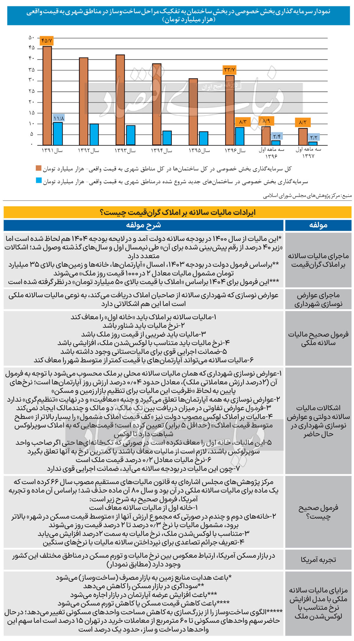 غفلت از یک ابزار کارآمد و آزموده‌شده مالیاتی در بخش املاک و مستغلات و اتکای صرف بر فرمول مالیات‌‌‌ستانی از املاک فوق‌‌‌لوکس مورد توجه بازوی پژوهشی مجلس قرار گرفته است. مرکز پژوهش‌‌‌های مجلس با انتشار یک مطالعه با عنوان «مالیات بر دارایی، مالیات سالانه املاک گران‌قیمت» ضمن بررسی انواع مالیات‌‌‌های ملکی متعارف که در کشورهای توسعه‌یافته مورد توجه قرار گرفته و نیز قوانین مرتبط با اخذ مالیات‌‌‌های ملکی در ایران طی سه دهه گذشته، فرمولی برای مالیات‌‌‌ستانی پیشنهاد کرده که چارچوب آن، همان چارچوب مالیات سالانه ملکی است. این موضوع از آن جهت مورد توجه پژوهشگران این مرکز قرار گرفته است که اجرای قوانین موجود در حوزه مالیات‌‌‌ستانی از املاک تاکنون نتیجه‌‌‌ای که باید را به دنبال نداشته و اهداف مالیاتی حداقلی پیش‌بینی‌شده در بودجه‌‌‌های سنواتی از این محل محقق نشده است؛ موضوعی که نشان می‌دهد قوانین مالیات ملکی موجود مشکلاتی دارد.