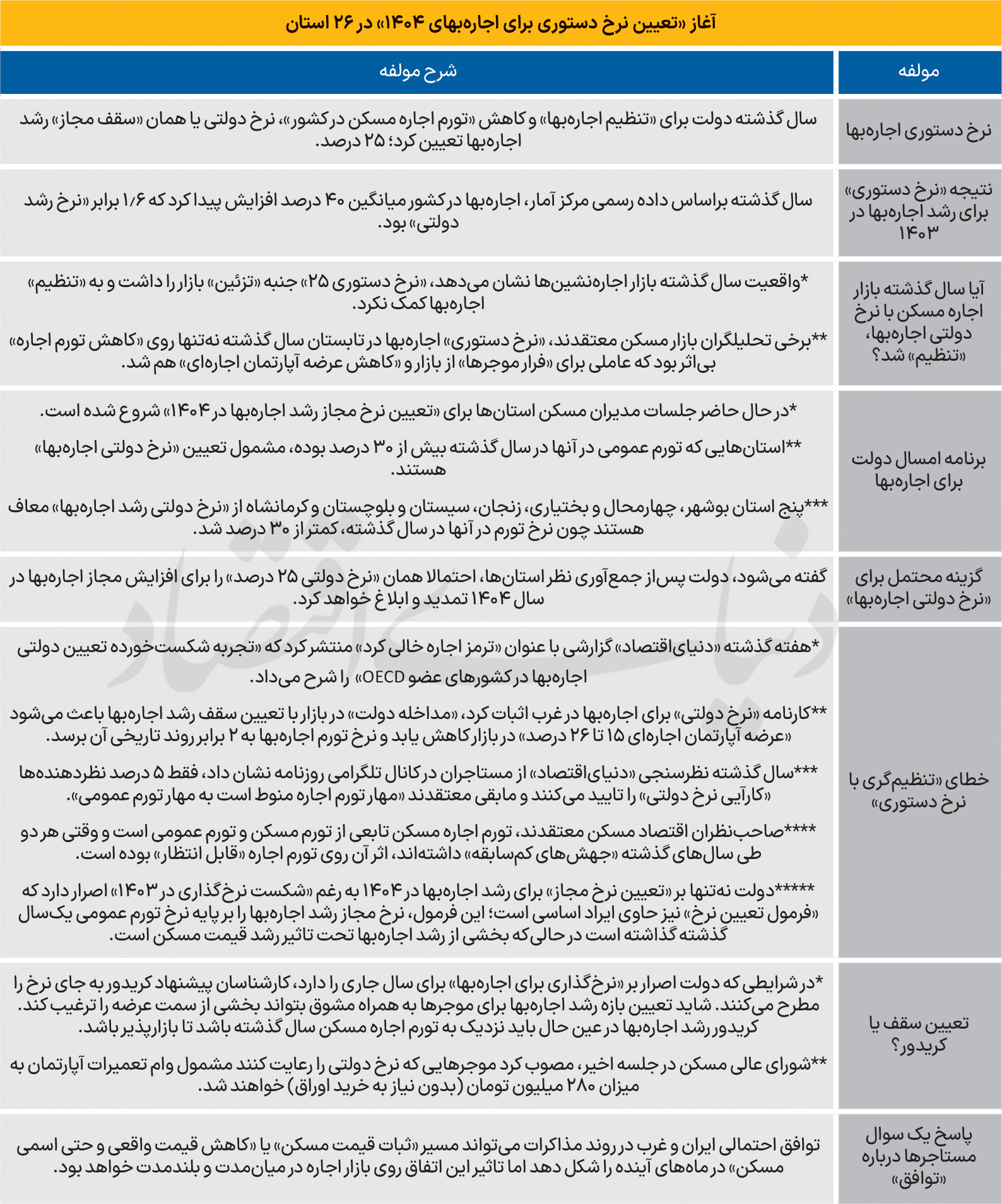 به گزارش روابط عمومی انجمن انبوه سازان مسکن و ساختمان آذربایجان شرقی، مدیران بخش مسکن 26 استان کشور از ابتدای این هفته مامور «تعیین نرخ مجاز رشداجاره‌بها در سال 1404» شدند و جلسات خود را برای تعیین نرخ دولتی با هدف «تنظیم بازار» آغاز کردند. این اقدام در ادامه روندی است که متولی مسکن دولت در سال گذشته برای «تنظیم بازار» و کاهش تورم اجاره مسکن در کشور «سقف مجاز» 25درصدی رشد اجاره‌‌‌بها را تعیین کرد. اما نرخ‌‌‌گذاری دولتی بازار اجاره‌‌‌بها در سال 1403 نشان می‌دهد، به جای «تنظیم» بازار اجاره، بیشتر آن را «تزئین» کرده است.