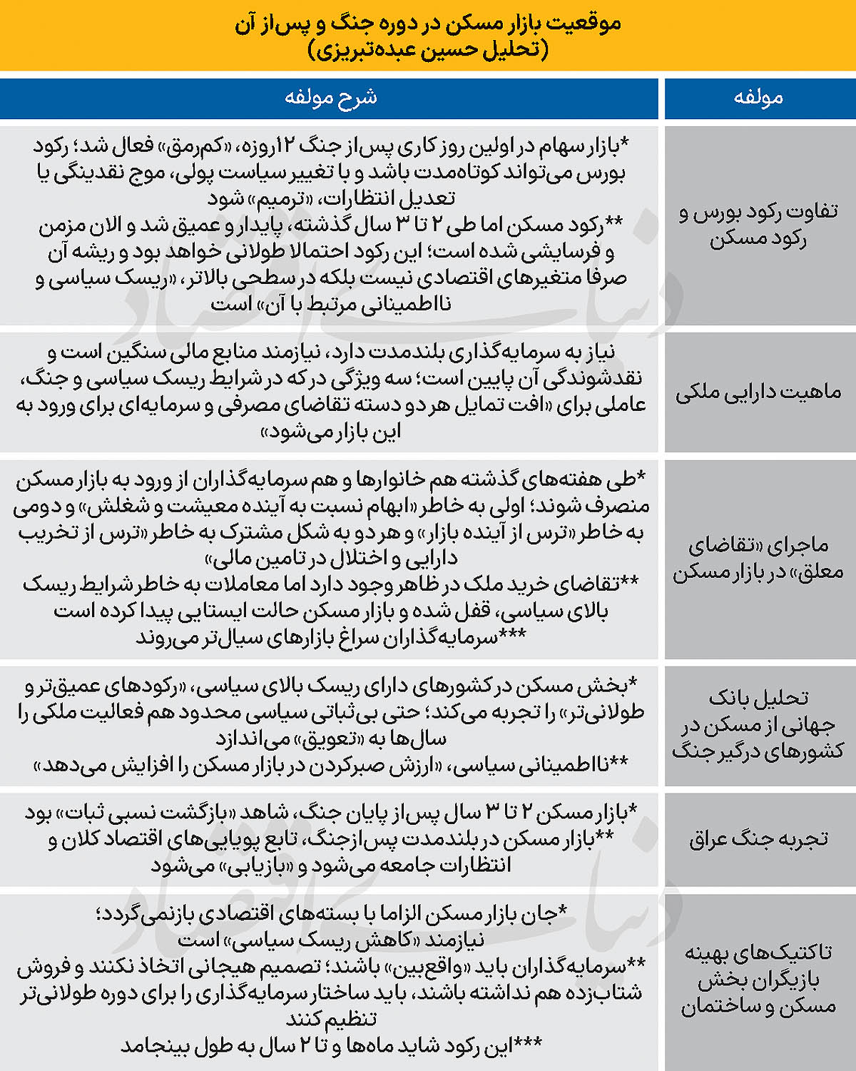 متن کامل این تحلیل و بررسی که در اختیار ما قرار گرفته، وضعیت بازار مسکن از ۲۳ خرداد، همزمان با شروع تجاوزگری رژیم صهیونیستی به ایران، تاکنون را شرح داده است. این مطالعه در ۵ تصویر، ابتدا «تفاوت رکود بورس با رکود مسکن» را توضیح می‌دهد و سپس با استناد به «گزارش سال ۲۰۱۹ بانک جهانی درباره رفتار بازار مسکن در کشورهای درگیر ریسک‌‌‌های بالای سیاسی»، به افت شدید معاملات خرید خانه در هفته‌‌‌های اخیر تحت‌تاثیر «رخداد تقاضای معلق در بازار» می‌‌‌پردازد و در نهایت، «چشم‌‌‌انداز رکود جنگی بر اساس رفتار مسکن پس‌‌‌از جنگ تحمیلی ۸ساله» و «تاکتیک‌‌‌های بهینه ویژه سرمایه‌گذاران بخش مسکن و ساختمان برای عبور از شرایط فعلی» را توضیح می‌دهد. متن مقاله حسین عبده‌‌‌تبریزی درباره بازار مسکن این روزها را در زیر بخوانید: